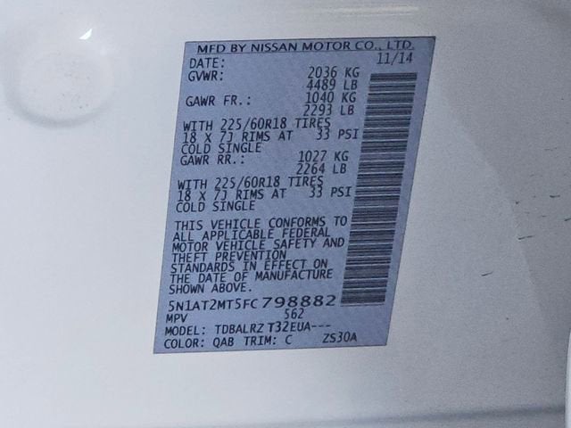 Pearl White 2015 Nissan Rogue SLOdometer is 38674 miles below market average! 26/33 City/Highway MPGAwards:* 2015 KBB.com 10 Best Used Compact SUVs Under $15,000 BUY ONLINE-TEXT-EMAIL-CHAT-PHONE AND WE WILL DELIVER YOUR NEXT VEHICLE TO YOUR DOOR!COAST COMMITMENT - NO ADDENDUMS • TRANSPARENT PRICINGRIDE THE WAVE TO COASTCLEAN AND SANITIZED.Equipped with 18 Alloy Wheels, 4-Wheel Disc Brakes, 5.694 Axle Ratio, 9 Speakers, ABS brakes, Activation Disclaimer, Air Conditioning, Alloy wheels, AM/FM radio: SiriusXM, Anti-whiplash front head restraints, Automatic temperature control, Brake assist, Bumpers: body-color, CD player, Delay-off headlights, Driver door bin, Driver vanity mirror, Dual front impact airbags, Dual front side impact airbags, Electronic Stability Control, Exterior Parking Camera Rear, Floor Mats & 2-PC Cargo Area Protector, Four wheel independent suspension, Front anti-roll bar, Front Bucket Seats, Front Center Armrest w/Storage, Front dual zone A/C, Front fog lights, Front reading lights, Fully automatic headlights, Heated door mirrors, Heated Front Bucket Seats, Heated front seats, Illuminated entry, Leather Shift Knob, Leather-Appointed Seat Trim, Low tire pressure warning, Navigation System, Occupant sensing airbag, Outside temperature display, Overhead airbag, Overhead console, Panic alarm, Passenger door bin, Passenger vanity mirror, Power door mirrors, Power driver seat, Power Liftgate, Power steering, Power windows, Radio data system, Radio: AM/FM/CD/RDS/AUX NissanConnect w/Navigation, Rear anti-roll bar, Rear reading lights, Rear window defroster, Rear window wiper, Remote keyless entry, Retractable Cargo Cover, Roof rack: rails only, Security system, Speed control, Speed-sensing steering, Splash Guards, Split folding rear seat, Spoiler, Steering wheel mounted audio controls, Tachometer, Telescoping steering wheel, Tilt steering wheel, Traction control, Trip computer, Turn signal indicator mirrors, and Variably intermittent wipers.