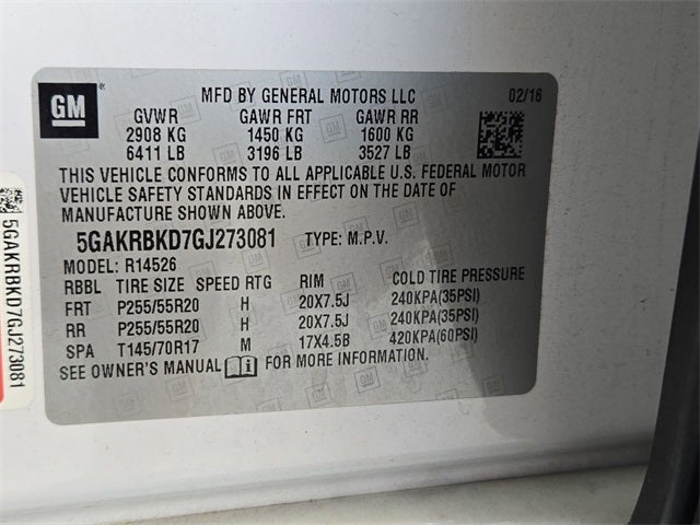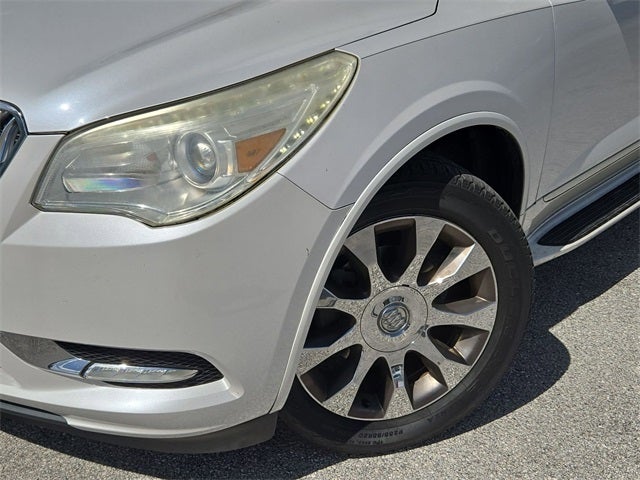 Equipped with Enclave Tuscan Edition (Bronze-Toned Grille and Wheels: 20 Chrome-Clad Cast Aluminum w/Bronze Pockets), Hit The Road Accessory Package (Body-Color Molded Assist Steps and Cargo Area All-Weather Floor Mat), Preferred Equipment Group 1SL (8-Way Power Driver Seat Adjuster, 8-Way Power Passenger Seat Adjuster, Heated Driver & Front Passenger Seats, Heated Steering Wheel, Memory Settings, and Side Blind Zone Alert w/Cross Traffic Alert), Roof Rack Cross Rail Package, 3.16 Axle Ratio, 3rd row seats: split-bench, 4-Wheel Disc Brakes, 6 Speakers, 7-Passenger Seating, ABS brakes, Air Conditioning, Alloy wheels, AM/FM radio: SiriusXM, Auto-dimming Rear-View mirror, Automatic temperature control, Brake assist, Bumpers: body-color, CD player, Compass, Delay-off headlights, Driver door bin, Driver vanity mirror, Dual front impact airbags, Dual front side impact airbags, Electronic Stability Control, Emergency communication system: OnStar Guidance, Exterior Parking Camera Rear, Four wheel independent suspension, Front anti-roll bar, Front Bucket Seats, Front Center Armrest w/Storage, Front dual zone A/C, Front reading lights, Fully automatic headlights, Garage door transmitter, Heated door mirrors, Heated front seats, Heated steering wheel, High intensity discharge headlights: Bi-Xenon, Illuminated entry, Leather steering wheel, Low tire pressure warning, Memory seat, Occupant sensing airbag, Outside temperature display, Overhead airbag, Panic alarm, Passenger door bin, Passenger vanity mirror, Perforated Leather-Appointed Seat Trim, Power door mirrors, Power driver seat, Power Liftgate, Power passenger seat, Power steering, Power windows, Radio data system, Radio: Color Touch AM/FM/CD w/IntelliLink, Rear air conditioning, Rear anti-roll bar, Rear Parking Sensors, Rear reading lights, Rear window defroster, Rear window wiper, Remote keyless entry, Roof rack: rails only, Security system, SiriusXM Satellite Radio, Speed control, Speed-sensing steering, Spoiler, Steering wheel mounted audio controls, Tachometer, Telescoping steering wheel, Tilt steering wheel, Traction control, Trip computer, Turn signal indicator mirrors, Variably intermittent wipers, Voltmeter, and Wheels: 19 10-Spoke Aluminum.