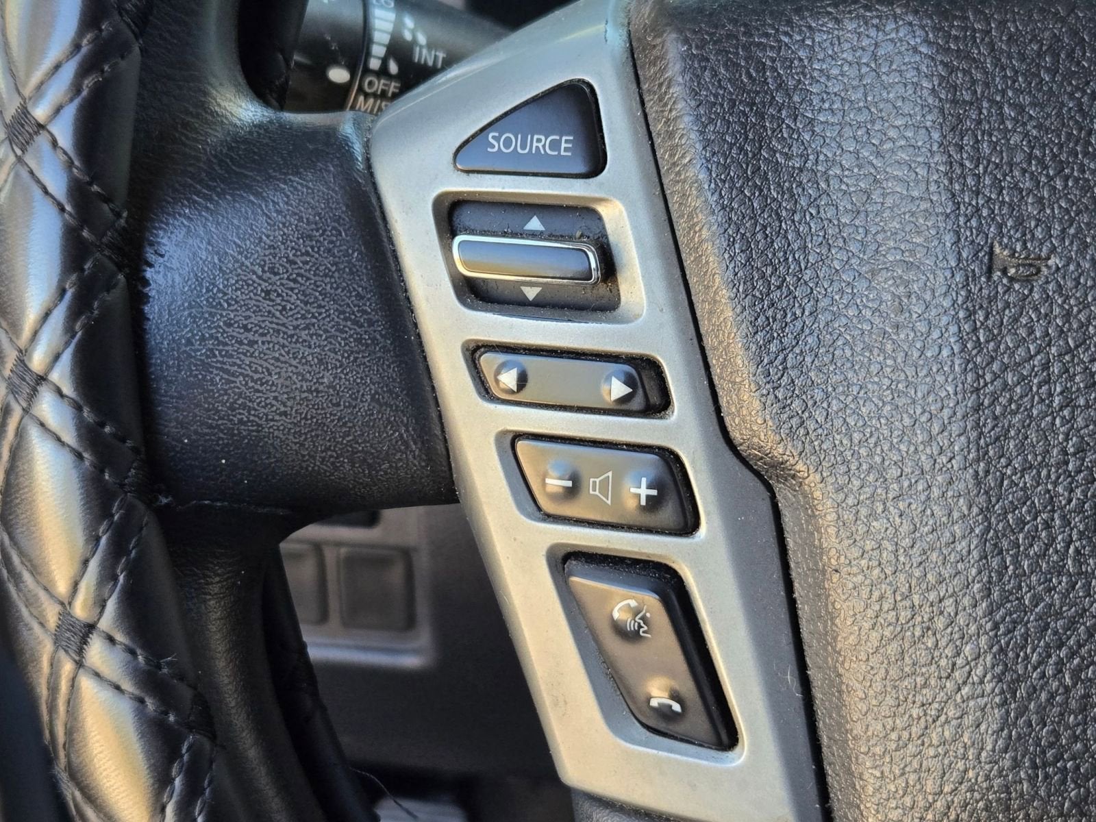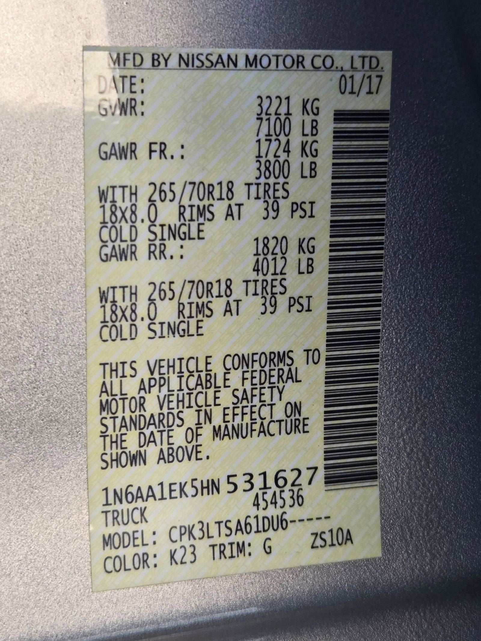 Equipped with 2.937 Axle Ratio, 4-Wheel Disc Brakes, 6 Speakers, ABS brakes, Air Conditioning, Alloy wheels, AM/FM radio: SiriusXM, Brake assist, Bumpers: chrome, Carpeted Floor Mats, CD player, Driver door bin, Driver vanity mirror, Dual front impact airbags, Dual front side impact airbags, Electronic Stability Control, Electronic Tailgate Lock, Front anti-roll bar, Front Center Armrest w/Storage, Front Manual Split Bench Seat (40/20/40), Front reading lights, Front wheel independent suspension, Heated door mirrors, Heated Front Captain's Chairs, Illuminated entry, Leather Seat Trim, Low tire pressure warning, Occupant sensing airbag, Outside temperature display, Overhead airbag, Overhead console, Panic alarm, Passenger door bin, Passenger vanity mirror, Power door mirrors, Power steering, Power windows, Radio data system, Radio: NissanConnect w/SiriusXM & Mobile Apps, Rear anti-roll bar, Rear seat center armrest, Rear step bumper, Rear window defroster, Remote keyless entry, Security system, Speed control, Speed-sensing steering, Speed-Sensitive Wipers, Splash Guards, Split folding rear seat, Steering wheel mounted audio controls, Tachometer, Telescoping steering wheel, Tilt steering wheel, Traction control, Trip computer, Turn signal indicator mirrors, Variably intermittent wipers, Voltmeter, and Wheels: 18 x 8 Silver Painted Alloy.