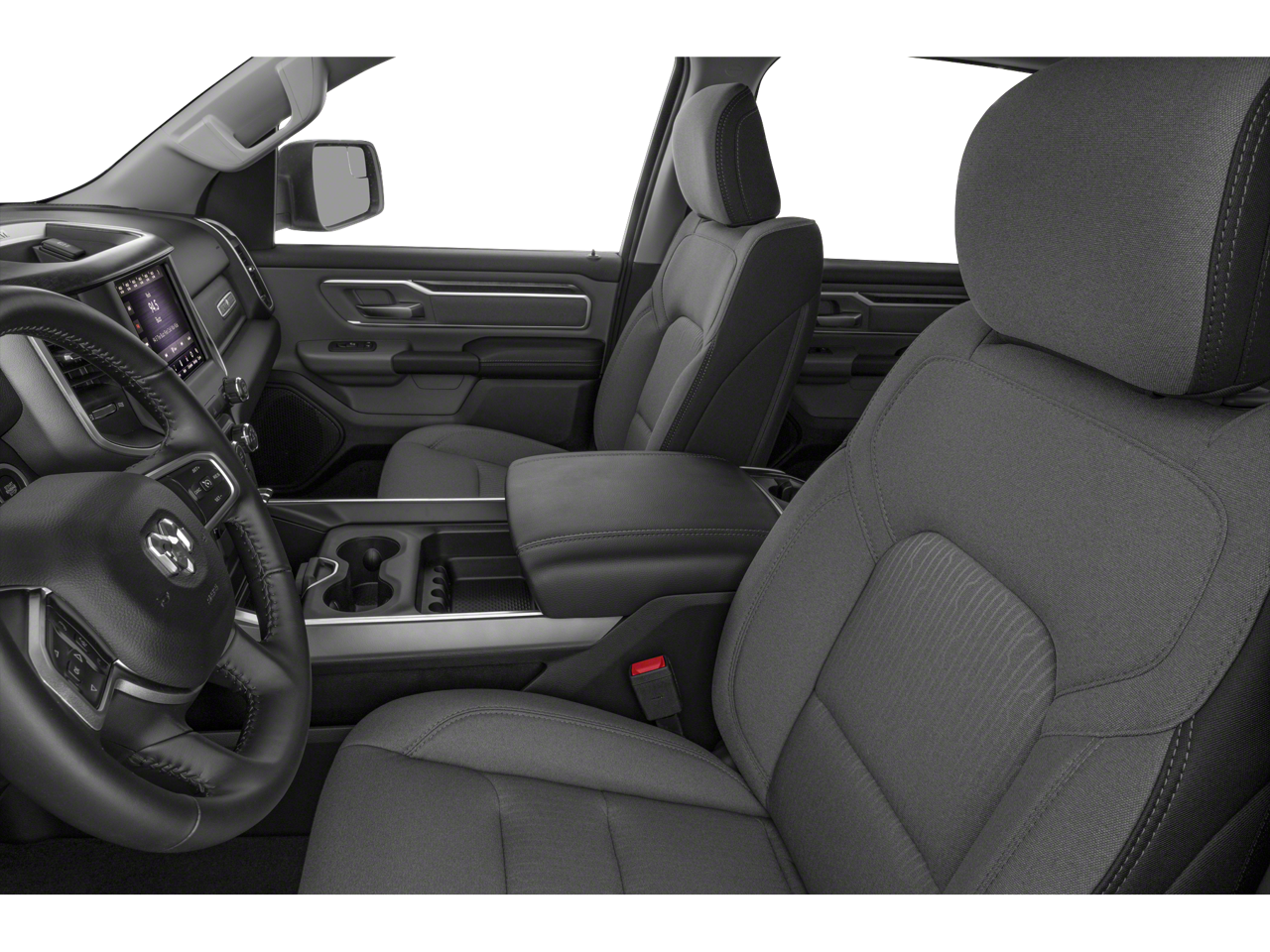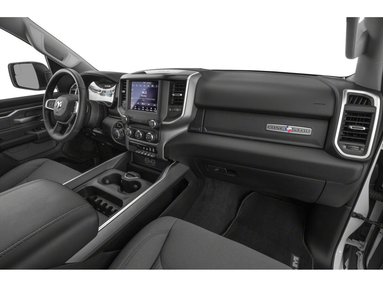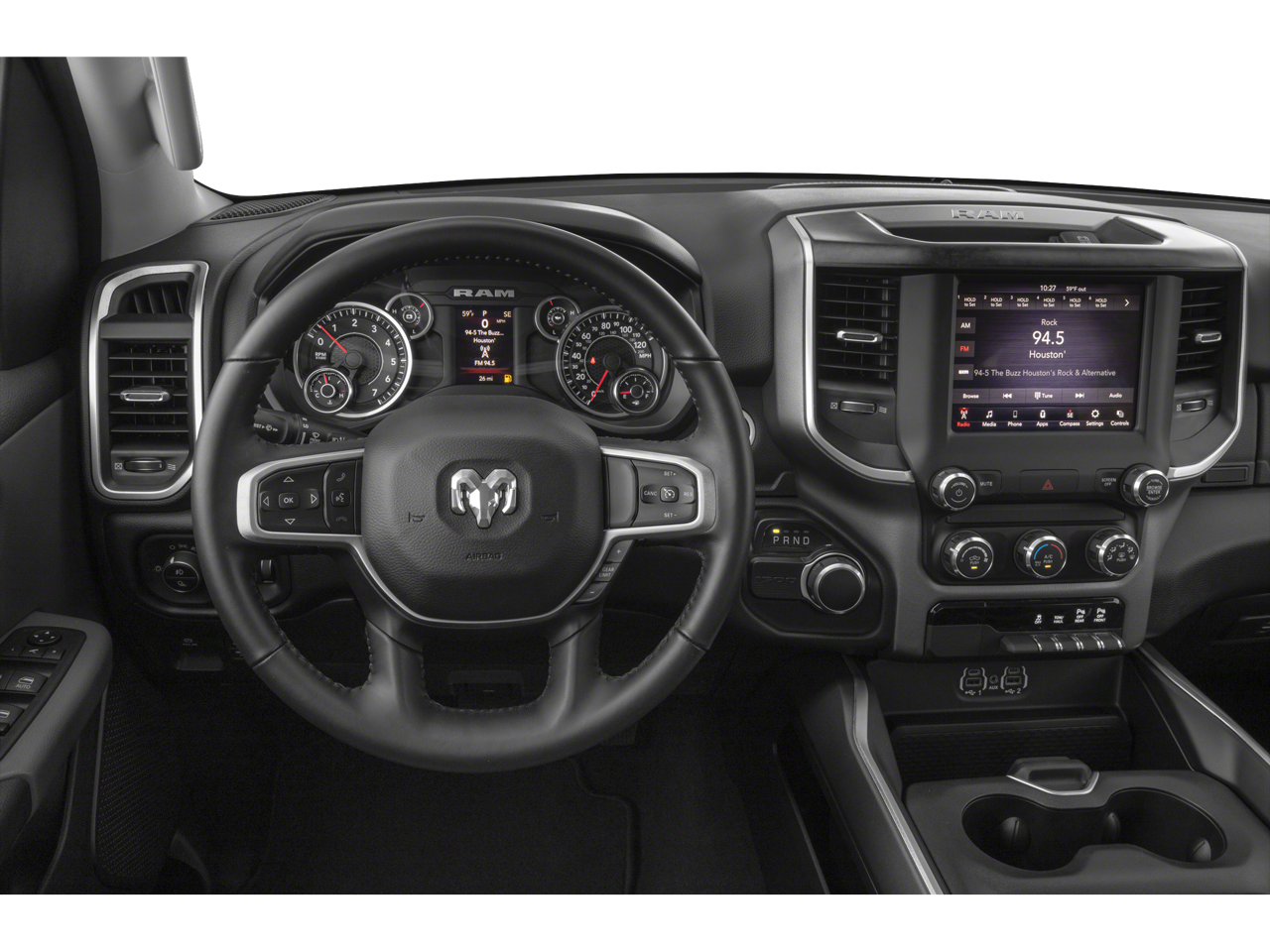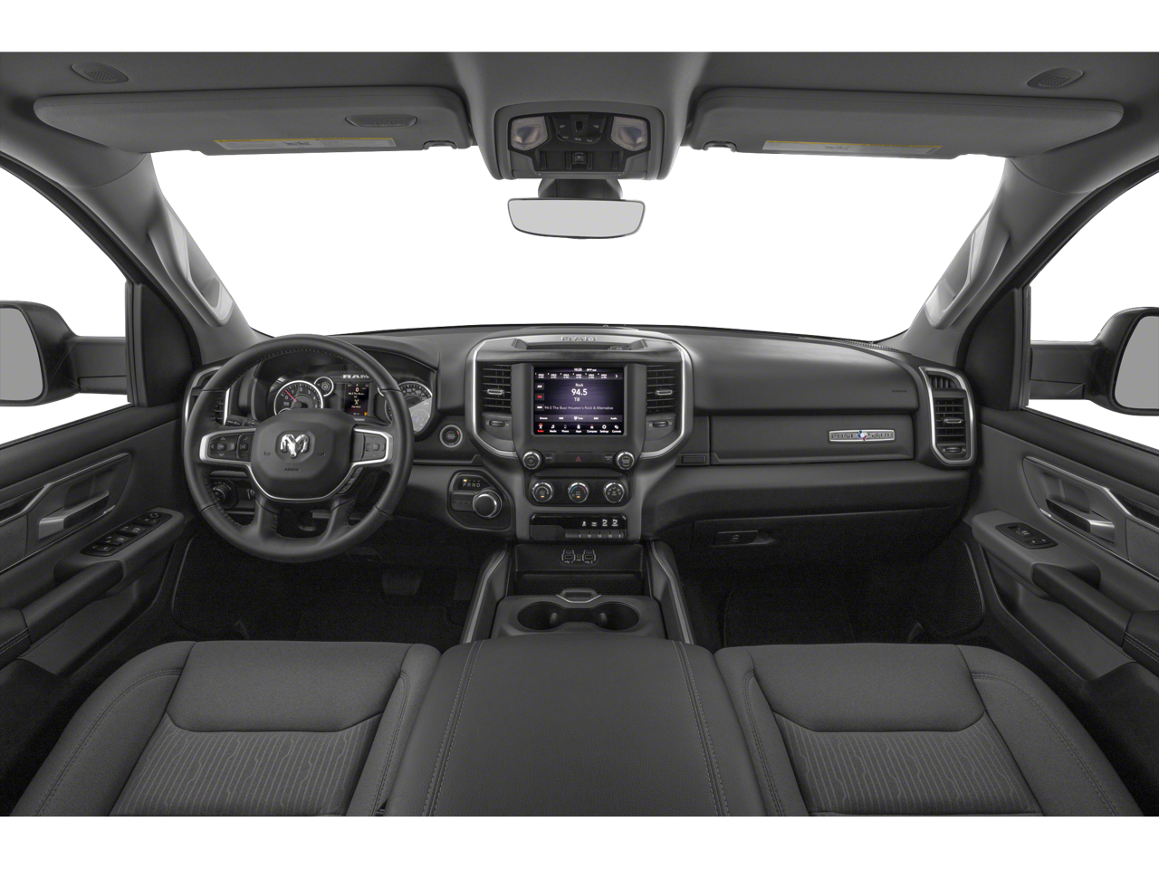 Equipped with Quick Order Package 25Z Big Horn/Lone Star (Steering Wheel Mounted Audio Controls), 3 Rear Seat Head Restraints, 3.21 Rear Axle Ratio, 4 Way Front Headrests, 4-Wheel Disc Brakes, 48V Belt Starter Generator, 6 Speakers, ABS brakes, Air Conditioning, Alloy wheels, AM/FM radio, Brake assist, Bumpers: chrome, Cloth Bench Seat, Compass, Delay-off headlights, Driver door bin, Dual front impact airbags, Dual front side impact airbags, Electronic Stability Control, Front anti-roll bar, Front Center Armrest w/Storage, Front fog lights, Front reading lights, Front Seat Back Map Pockets, Front wheel independent suspension, Fully automatic headlights, GPS Antenna Input, Heated door mirrors, Illuminated entry, Leather steering wheel, Low tire pressure warning, Occupant sensing airbag, Outside temperature display, Overhead airbag, Overhead console, Panic alarm, ParkView Rear Back-Up Camera, Passenger door bin, Passenger vanity mirror, Power door mirrors, Power steering, Power windows, Radio data system, Radio: Uconnect 3 w/5 Display, Rear 60/40 Folding Seat, Rear anti-roll bar, Rear seat center armrest, Rear step bumper, Remote keyless entry, Speed control, Split folding rear seat, Tachometer, Telescoping steering wheel, Tilt steering wheel, Traction control, Trip computer, Variably intermittent wipers, Voltmeter, and Wheels: 18 x 8