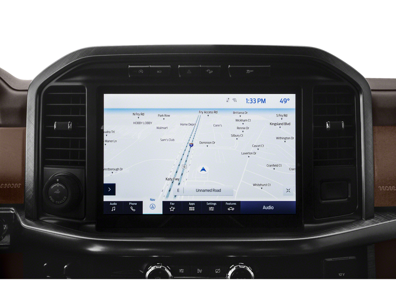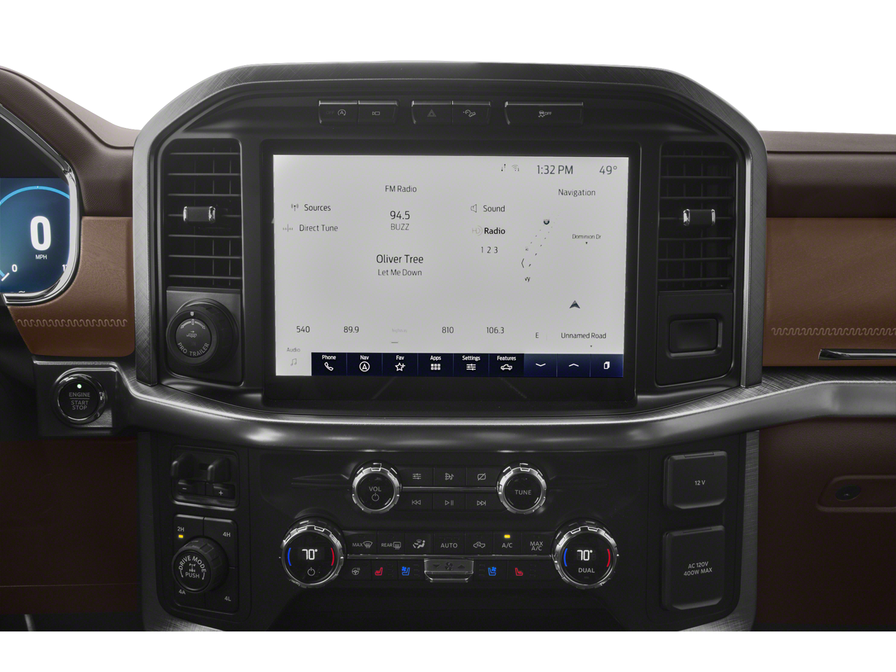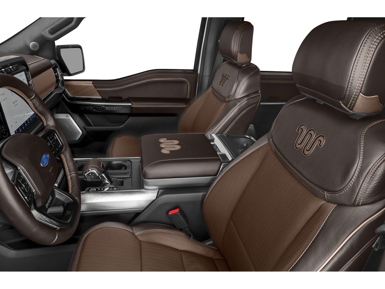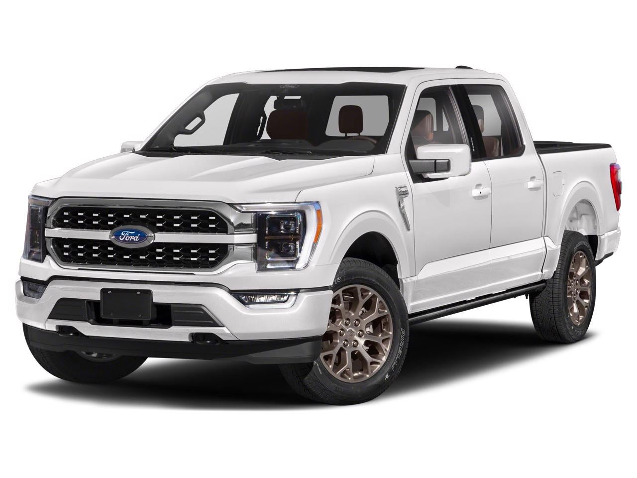 Equipped with Equipment Group 601A High (Power Tailgate, Power-Deployable Running Boards, and Radio: B&O Unleashed Sound System by Bang & Olufsen), Ford Co-Pilot360 Active 2.0 Package (Active Park Assist 2.0 and BlueCruise Hands-Free Driving), FX4 Off-Road Package (4x4 FX4 Off-Road Bodyside Decal, Hill Descent Control, Monotube Rear Shocks, Off-Road Tuned Front Shock Absorbers, Rock Crawl Mode, and Tray Style Floor Liner), King Ranch Chrome Appearance Package (Bright Belt Moldings, Chrome Door Handles w/Body-Color Strap, Chrome Skull Caps on Exterior Mirrors, and Wheels: 20 Chrome-Like PVD), King Ranch Monochromatic Paint Package (Painted Body-Color Wheellip Molding), Max Trailer Tow Package (Class IV Trailer Hitch Receiver, Extended Range 36 Gallon Fuel Tank, Integrated Trailer Brake Controller, and Pro Trailer Backup Assist), 3.5L PowerBoost Full-Hybrid V6, 4WD, 18 Machined-Aluminum Wheels, 360 Degree Camera, 4-Wheel Disc Brakes, 8 Speakers, ABS brakes, Adjustable pedals, Air Conditioning, Alloy wheels, AM/FM radio: SiriusXM with 360L, Auto High-beam Headlights, Auto tilt-away steering wheel, Auto-dimming door mirrors, Auto-dimming Rear-View mirror, Automatic temperature control, Brake assist, Compass, Delay-off headlights, Driver door bin, Driver vanity mirror, Dual front impact airbags, Dual front side impact airbags, Electronic Stability Control, Emergency communication system: SYNC 4 911 Assist, Exterior Parking Camera Rear, Front anti-roll bar, Front Bucket Seats, Front Center Armrest, Front dual zone A/C, Front fog lights, Front reading lights, Front wheel independent suspension, Fully automatic headlights, Garage door transmitter, Genuine wood console insert, Genuine wood dashboard insert, Genuine wood door panel insert, Heated door mirrors, Heated front seats, Heated rear seats, Heated steering wheel, Illuminated entry, Interior Work Surface, King Ranch Leather Bucket Seats, LED Sideview Mirror Spotlights, Low tire pressure warning, Memory seat, Navigation system: Connected Navigation (90-Day Trial), Occupant sensing airbag, Outside temperature display, Overhead airbag, Overhead console, Panic alarm, Partitioned Lockable Fold-Flat Storage, Passenger door bin, Passenger vanity mirror, Pedal memory, Power door mirrors, Power driver seat, Power passenger seat, Power steering, Power windows, Pro Power Onboard - 7.2KW, Radio data system, Radio: B&O Sound System by Bang & Olufsen, Rain sensing wipers, Rear reading lights, Rear seat center armrest, Rear step bumper, Rear window defroster, Remote keyless entry, Security system, Speed control, Speed-sensing steering, Split folding rear seat, Steering wheel memory, Steering wheel mounted audio controls, SYNC 4 w/Enhanced Voice Recognition, Tachometer, Telescoping steering wheel, Tilt steering wheel, Traction control, Trip computer, Turn signal indicator mirrors, Twin Panel Moonroof, Variably intermittent wipers, Ventilated front seats, and Voltmeter.
