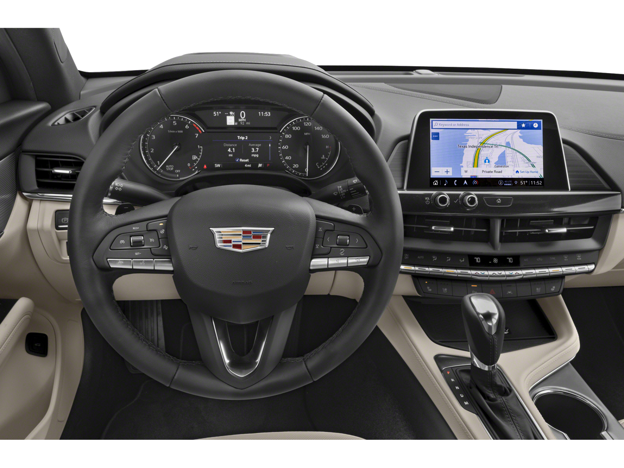 Equipped with Preferred Equipment Group 1SB, 4-Wheel Disc Brakes, 8 Speakers, ABS brakes, Air Conditioning, Alloy wheels, AM/FM radio: SiriusXM with 360L, Anti-whiplash front head restraints, Apple CarPlay/Android Auto, Auto High-beam Headlights, Automatic Stop/Start w/Disable, Automatic temperature control, Brake assist, Bumpers: body-color, Compass, Delay-off headlights, Driver 2-Way Power Lumbar Seat Adjuster, Driver door bin, Driver vanity mirror, Dual front impact airbags, Dual front side impact airbags, Electronic Stability Control, Emergency communication system: OnStar and Cadillac connected services capable, Four wheel independent suspension, Front anti-roll bar, Front Bucket Seats, Front Center Armrest, Front dual zone A/C, Front reading lights, Fully automatic headlights, HD Radio, Heated door mirrors, Illuminated entry, Inteluxe Seats, Knee airbag, Leather Shift Knob, Leather steering wheel, Low tire pressure warning, Occupant sensing airbag, Outside temperature display, Overhead airbag, Overhead console, Panic alarm, Passenger door bin, Passenger vanity mirror, Power door mirrors, Power driver seat, Power passenger seat, Power steering, Power windows, Premium 8-Speaker Audio System Feature, Radio data system, Radio: Cadillac User Experience, Rear anti-roll bar, Rear reading lights, Rear seat center armrest, Rear window defroster, Remote keyless entry, SiriusXM w/360L, Speed control, Speed-sensing steering, Split folding rear seat, Steering wheel mounted audio controls, Tachometer, Telescoping steering wheel, Tilt steering wheel, Traction control, Trip computer, Turn signal indicator mirrors, Variably intermittent wipers, Voltmeter, and Wheels: 17 Alloy w/Bright Silver Finish.